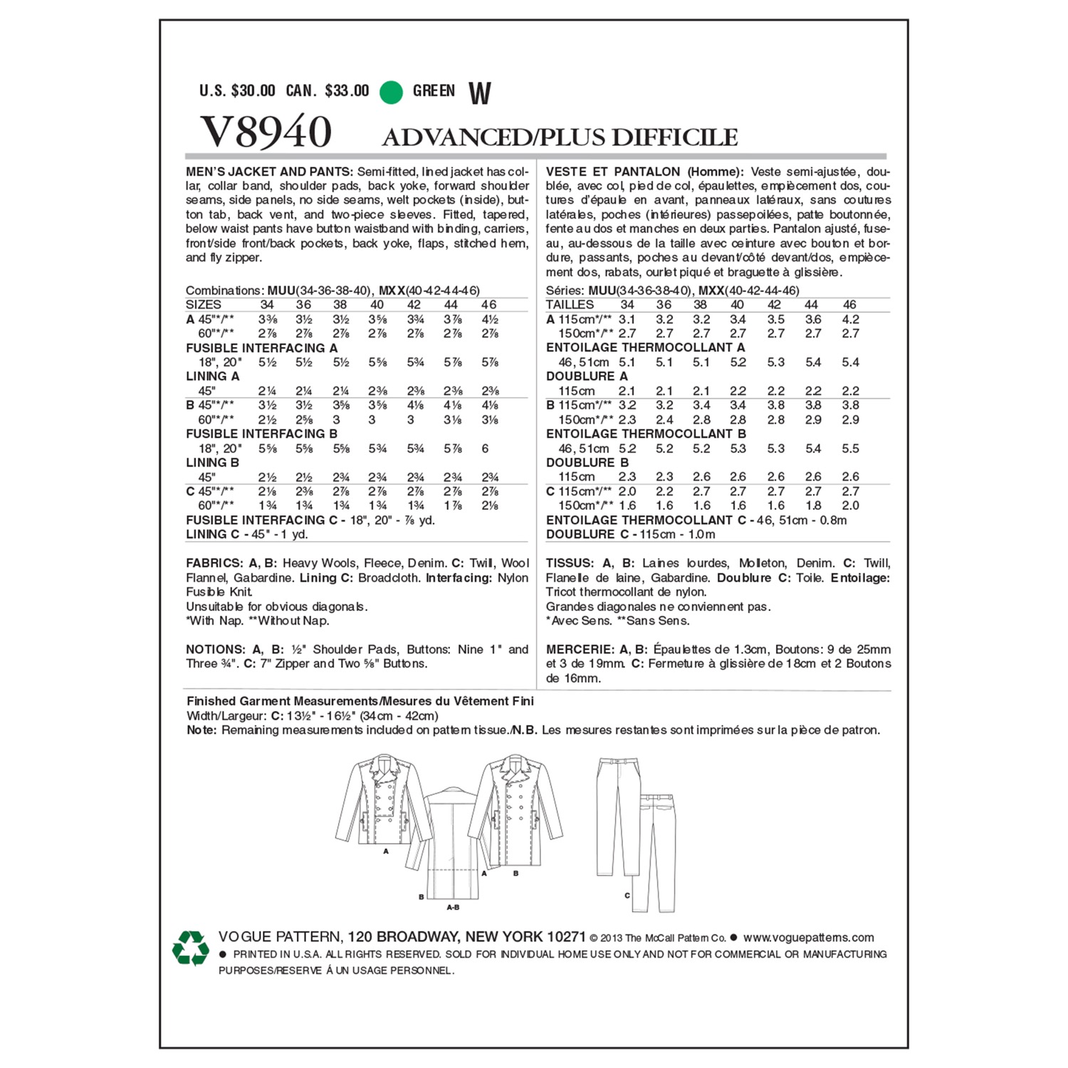 Einzelschnittmuster Vogue, kleine Größen, Herrenmode, Jacke, Hose, Grün