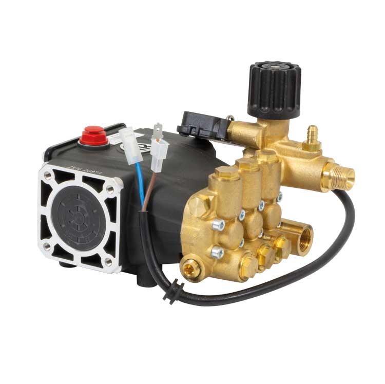 Volumetrische 3-Kolben-Wechselpumpen für den Einsatz in Reinigungsanlagen und industriellen Systemen. Kann direkt an verschiedene Motortypen gekoppelt werden. Pumpengehäuse aus Aluminiumdruckguss. Seitliche Abdeckung kann blind sein oder ein Ölschauglas enthalten (optional). Antrieb der Kolben durch Kurbelstangenmechanismus. Pumpenwelle aus hochfestem Stahl. Überdimensionierte Gleitlager. Pleuelstangen aus einer speziellen Zink-Aluminium-Legierung mit geringer Reibung im Druckgussverfahren. Kolben aus keramikbeschichtetem rostfreiem Stahl. Pumpenkopf aus Pressmessing. Doppeltes Dichtungssystem. Einlass- und Auslassventile mit Stopfen für eine einfachere Wartung. In den Pumpenkopf integrierte Regulierventile mit Reinigungsmittelinjektor.