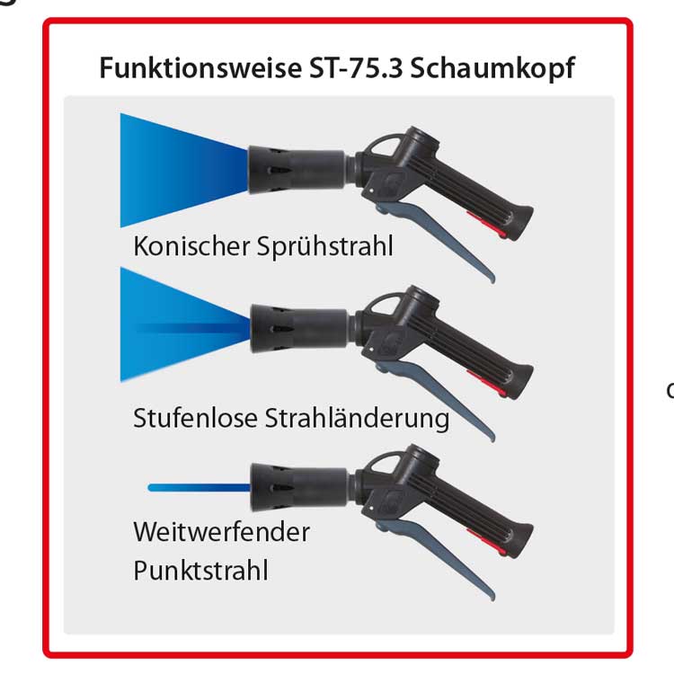 Der Schaumkopf ist für die Ausgabe von Reinigungsschaum bestimmt. Um einen hochwertigen Reinigungsschaum zu erzeugen, benötigen Sie ein Wasser-Chemikalien-Gemisch mit einer schäumbaren Reinigungschemikalie. Der Niederdruck-Schaumkopf ST-75.3 ist eine aktive Schaumdüse, d.h. der Schaumkopf selbst saugt Luft an, vermischt sie mit einem Wasser-Chemikalien-Gemisch und gibt den entstehenden Schaum ab.
