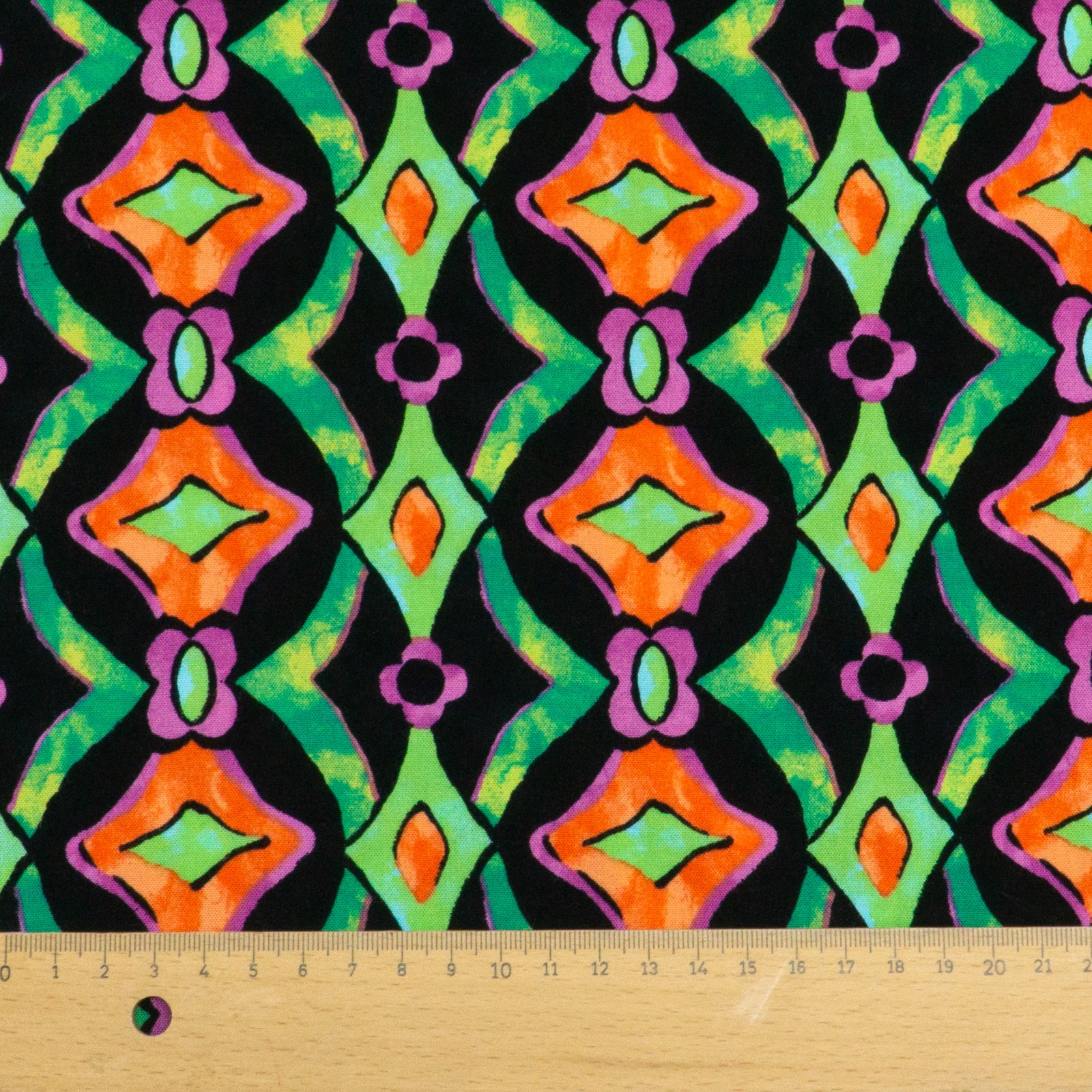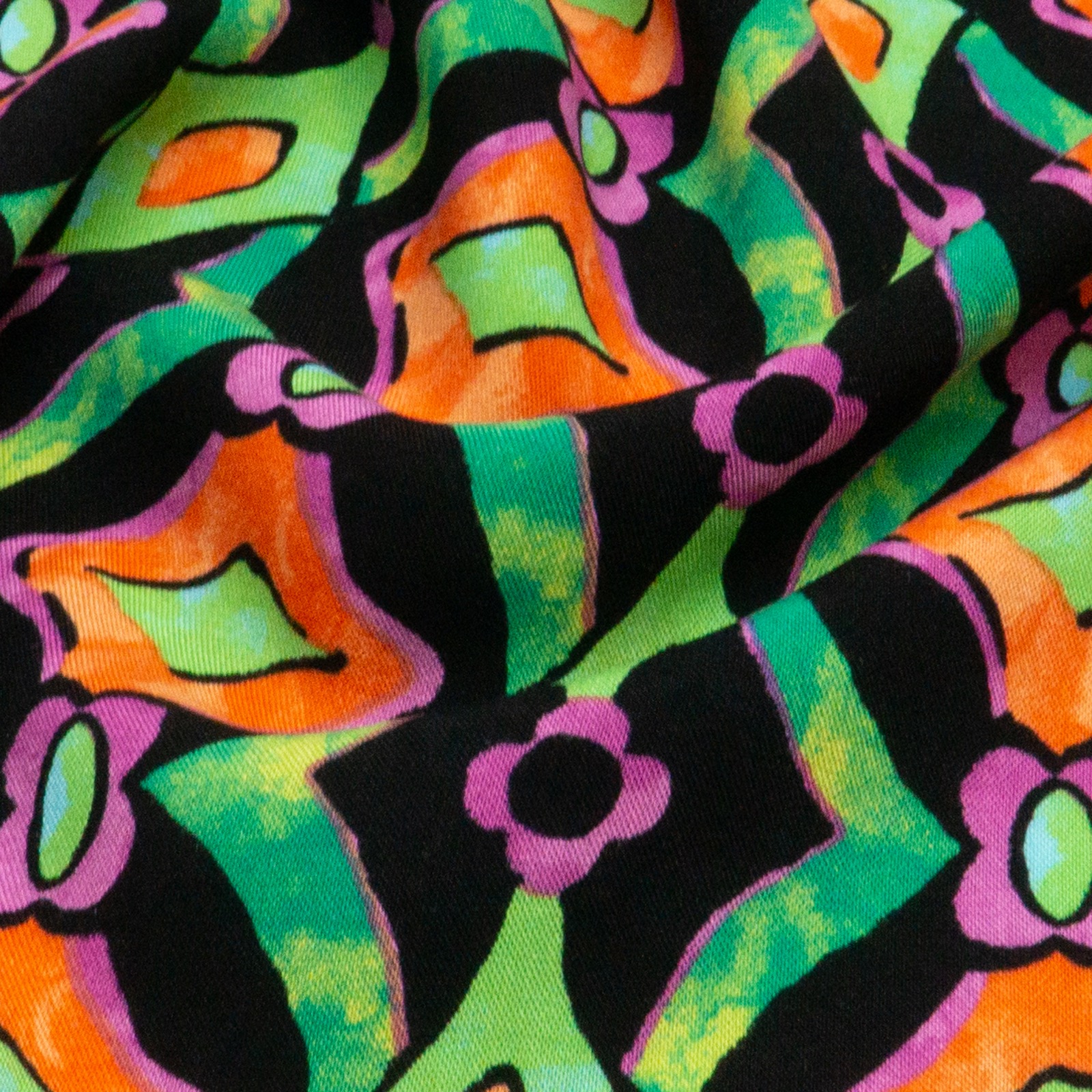 Viskosestoff, Javanaise, schwarz, grüntöne, rotorange, rosa, grafisch gemustert