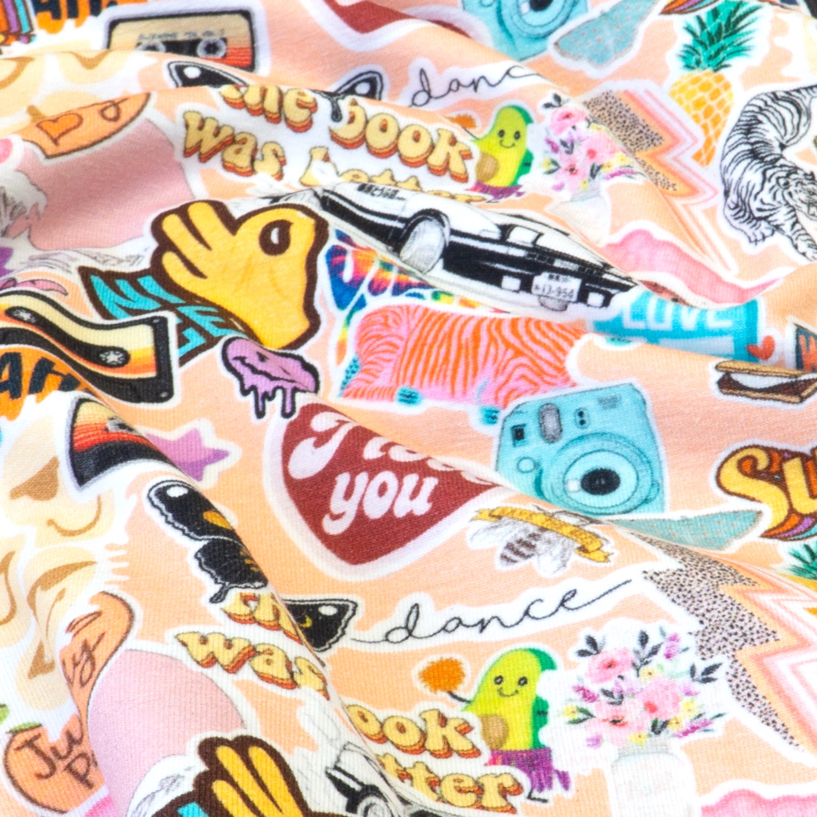 Weicher und elastischer Baumwolljersey bedruckt mit stickerartigen Motiven wie Schmetterlinge, Musikkassetten, Sofortbild Kameras, Avocados und Smileys. Geeignet z.B. für Shirts, Leggins, Pumphosen, Kleider und Accessoires.