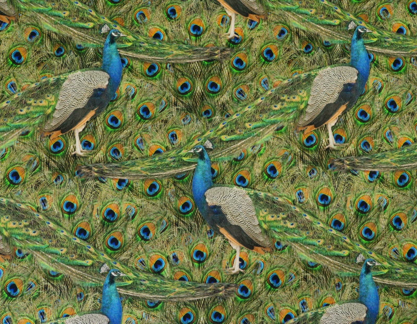 Dekostoff aus reiner Baumwolle üppig bedruckt mit fotorealistischen Pfauen und Pfauenfedern. Geeignet z.B. für Taschen, Vorhänge und Kissen.